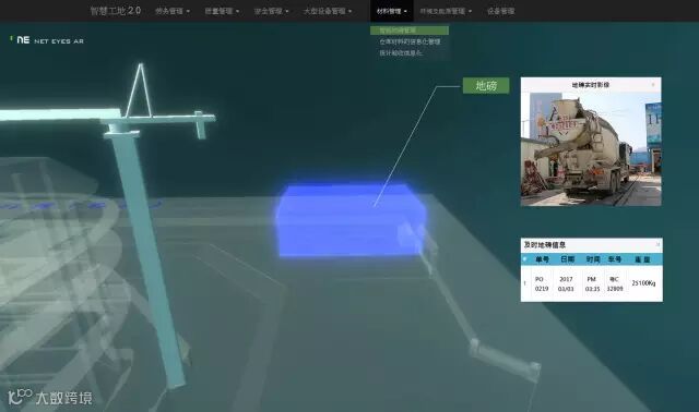 为工地地磅称重系统加装传感器及摄像机,在材料车辆进出场称重时,对称重数据进行自动记录、拍照、数据挂钩及上传,在智能云平台中自动形成材料进场报表,在材料净重数据出现异常时自动报警。