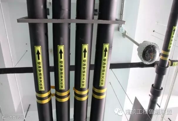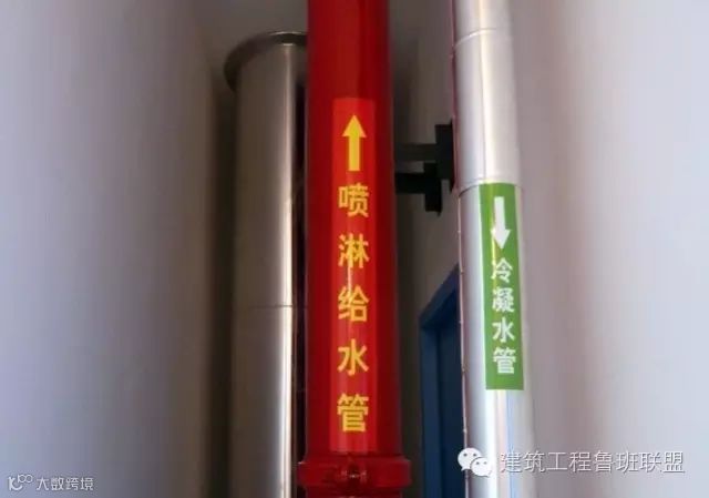 在规范中,对各种管线都有油漆颜色的要求。如:消防喷淋管红色,火灾报警管线白色防火涂料。在地下室机房等管线集中的场所,怎样强化管线、而弱化支吊架,是值得研究的问题。一些对颜色没有严格要求的管线,如果颜色配置的好,将对观感起到很好的作用,色彩运用得好,就会使人有光彩夺目的感觉。强化管线颜色、弱化支架的颜色,突出管线的美。各类管线标识、文字与流向箭头、大小、颜色、管道的位置,都将对工程质量起到点缀作用。