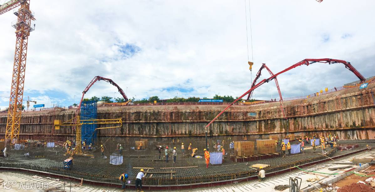 因项目的工期紧、体量大,为保证混凝土浇筑工作的顺利进行,项目部精心策划、超前部署,创新的采取了分组管理模式,将总包与劳务分包管理人员分成10个小组,分别带领工人对各重点区域进行施工,将各项指令下沉到各班组,确保混凝土按时浇筑。在浇筑过程中,项目部全体员工24小时昼夜轮流值班,一人一岗,强化过程控制,确保一次性浇筑成功。各项工作的充分准备、有序推进,为顺利实施大体积混凝土的浇筑奠定了坚实的基础。据悉,此次大体积混凝土浇筑是项目地下室筏板基础第一次浇筑,项目整体地下室筏板基础将分为5次浇筑完成。