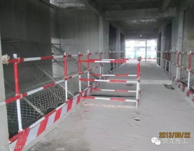 框架楼层临边的四周无围护结构时,必须设两至三道防护栏杆,栏杆高度不低于1.2m,立杆间距1.5m,并满挂密目安全网。