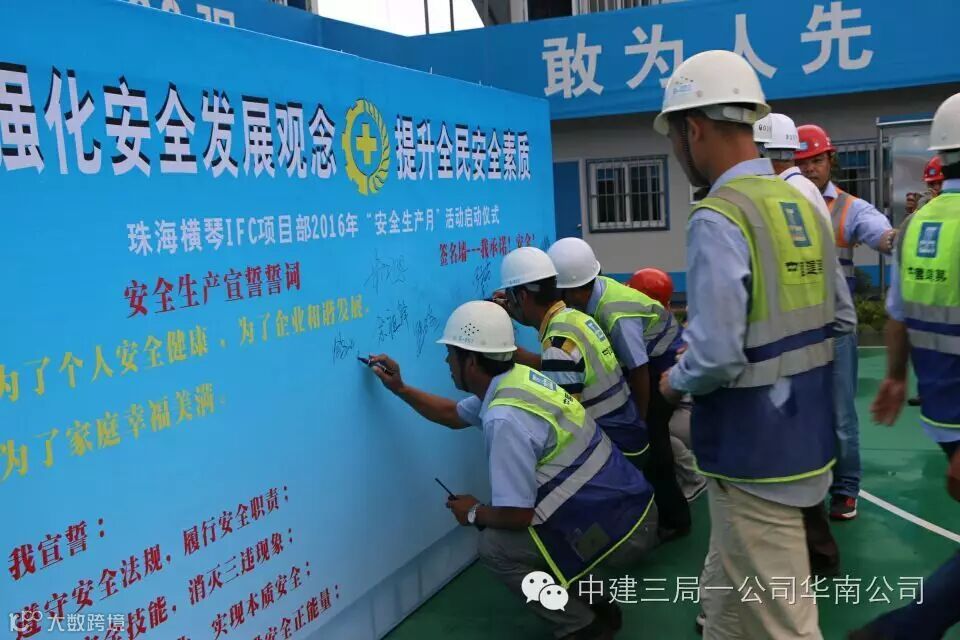 在第十五个全国“安全生产月”活动正式拉开帷幕之际,为全面建立“党政同责、一岗双责、齐抓共管”的安全生产体系,弘扬“以人为本,安全发展”的安全管理理念,5月27日, 华南公司珠海横琴国际金融中心大厦项目举行“安全生产月”启动仪式,业主单位、监理单位、项目全体员工和各分包单位管理人员80余人参加了此次活动。