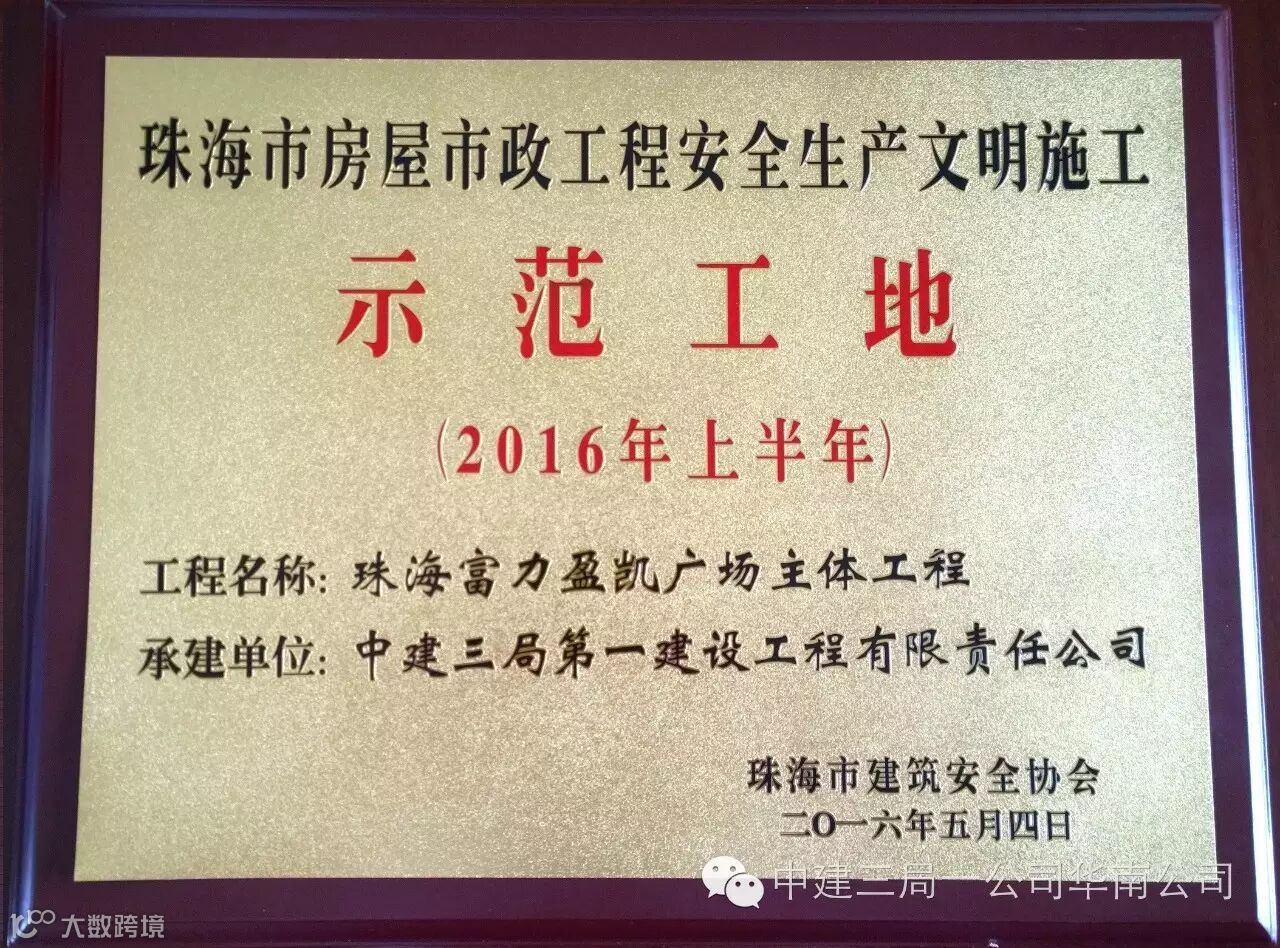 近日,从珠海市建筑安全协会传来喜讯:华南公司珠海富力盈凯广场项目荣获“珠海市房屋市政工程安全生产文明施工示范工地”称号。这也为华南公司“安全生产月”活动增添了光彩。