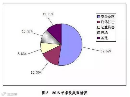 2016年,房屋市政工程生产安全事故按照类型划分,高处坠落事故333起,占总数的52.52%;物体打击事故97起,占总数的15.30%;起重伤害事故56起,占总数的8.83%;坍塌事故67起,占总数的10.57%;