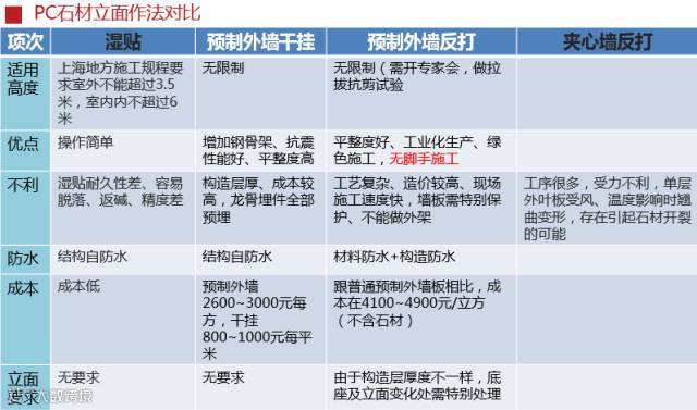 PC建筑对很多现有的建筑做法都有不同的影响,其中对外墙保温做法和石材立面做法的影响最为明显,下面两张表,清楚对比了各种做法的优缺点、成本和施工因素、适用性等方面。