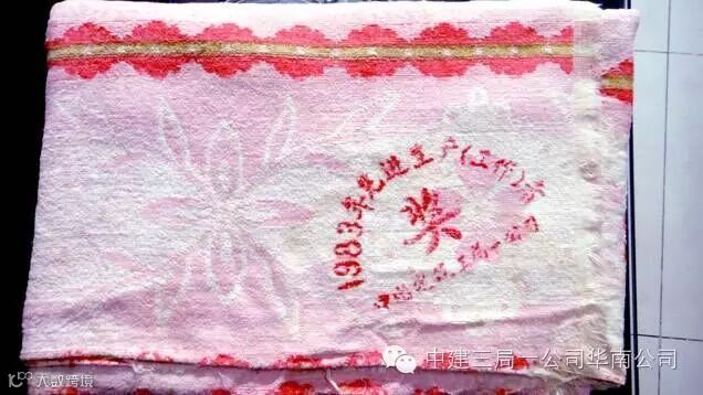 我小心翼翼地用双手将它捧出来,30年过去了,今天,它依然散发出阵阵温馨的气息,熟悉、温暖的感觉油然而生,捧在手里的感觉是那样的舒服与体贴,在毛巾被的一角有一排半圆形清晰可辨的小字:奖 1983 年先进生产工作者,中国建筑三局一公司。这是当年父亲唯一的“奖品”。