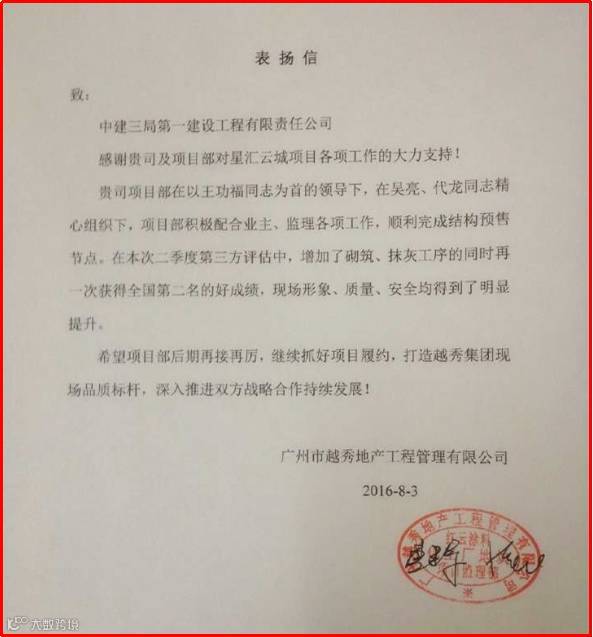 据悉,越秀星汇云城项目团队自2015年11月进场后,积极配合业主、监理的各项工作,克服重重困难,顺利完成结构预售节点,现场质量管理、安全文明施工管理等成绩斐然。