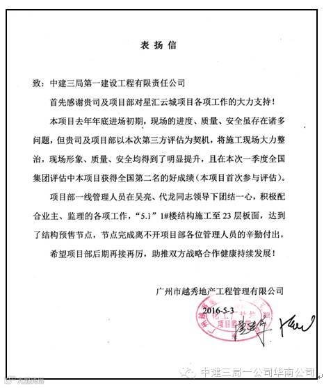 5月3日,华南公司广州越秀星汇运城项目喜获越秀地产工程管理有限公司的表扬信。