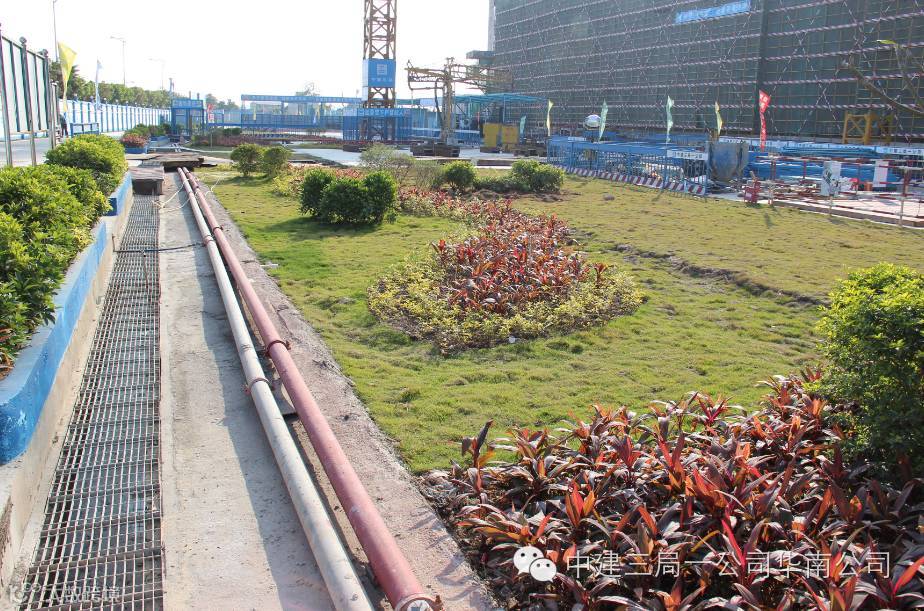 不仅如此,项目还在生活区与施工区间建立了一条长50米,宽3米的绿化隔离带,将两者分离开来。在生活区内搭建假山、水池、员工休闲区等,让员工真正的在一个绿色环境中工作和生活。