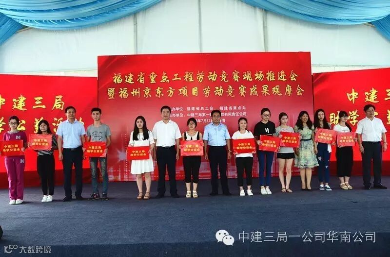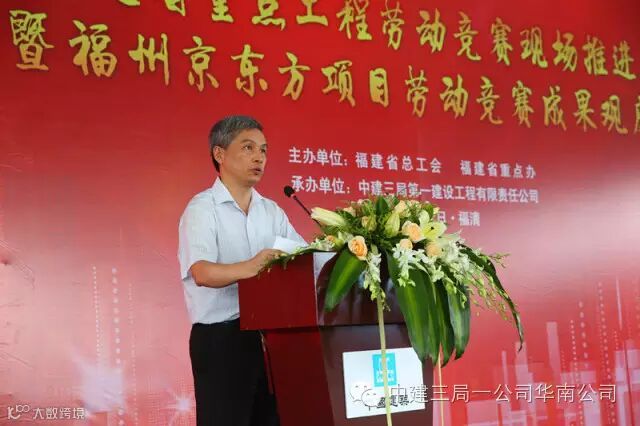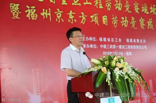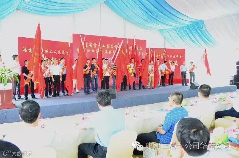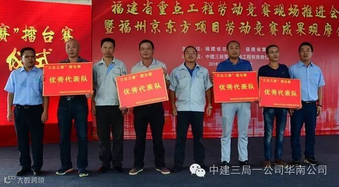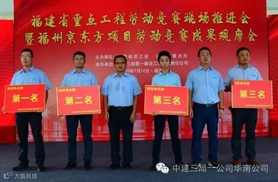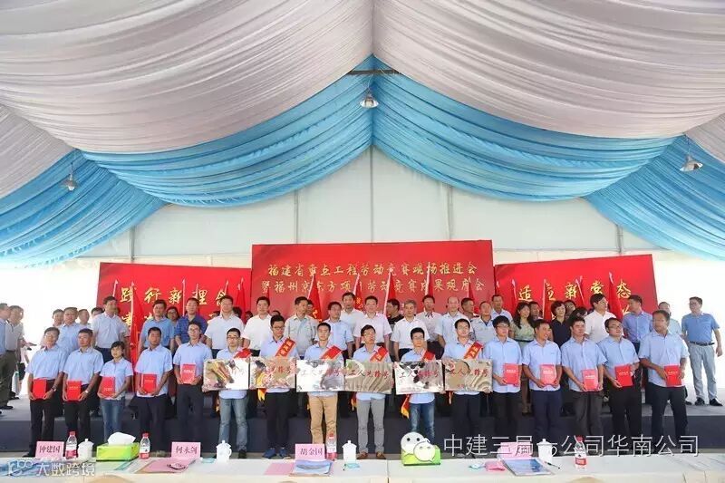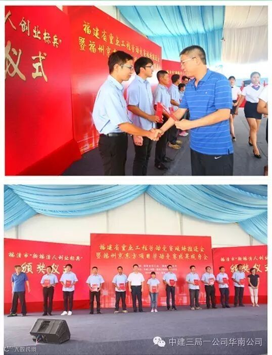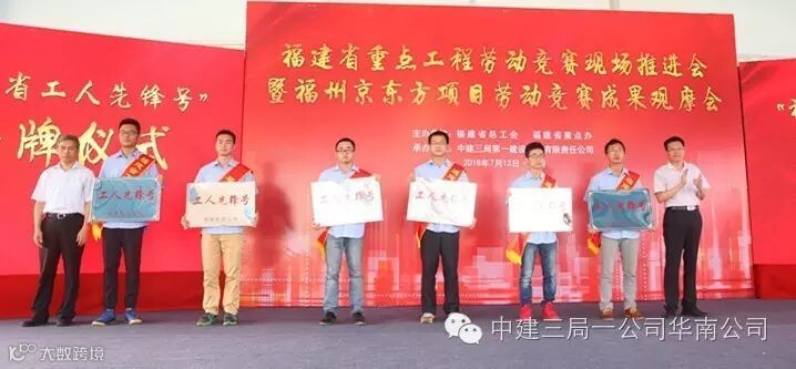 中建三局京东方项目10名建设者荣获福清市政府首次授予的 “新福清人创业标兵”光荣称号、6个班组被福建省总工会授予“福建省工人先锋号”奖牌。在授旗仪式上,19家福建省重点工程代表接过了福建省总工会授予的“争创工人先锋号”队旗,拉开了福建省新一轮劳动竞赛的热潮。