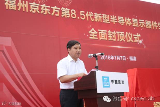 中建三局总经理易文权表示,作为福州市电子信息产业有史以来单体投资最大的项目,福州京东方项目对福州、福清两级政府打造东南沿海电视及显示器件产业基地意义重大,对京东方集团在东南地区完成战略布局意义重大。三局作为承建方责任重大,使命光荣。此次提前实现全面封顶,标志着三局团队经受住了第一场战役的考验,初步兑现了对业主和政府的承诺。他指出,项目后期协调、施工任务仍然非常艰巨,项目团队要一鼓作气、一如既往地高效优质履约,履行好总承包管理职责,严把质量关口,确保项目安全,实现工程完美收官,打造一座经得起时间、经得起业主、经得起社会检验的精品工程。