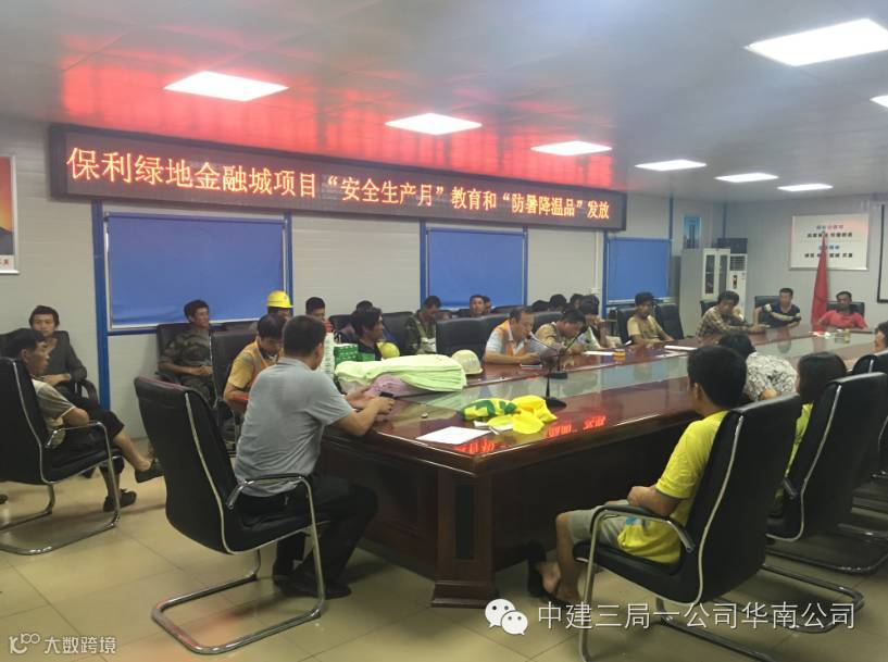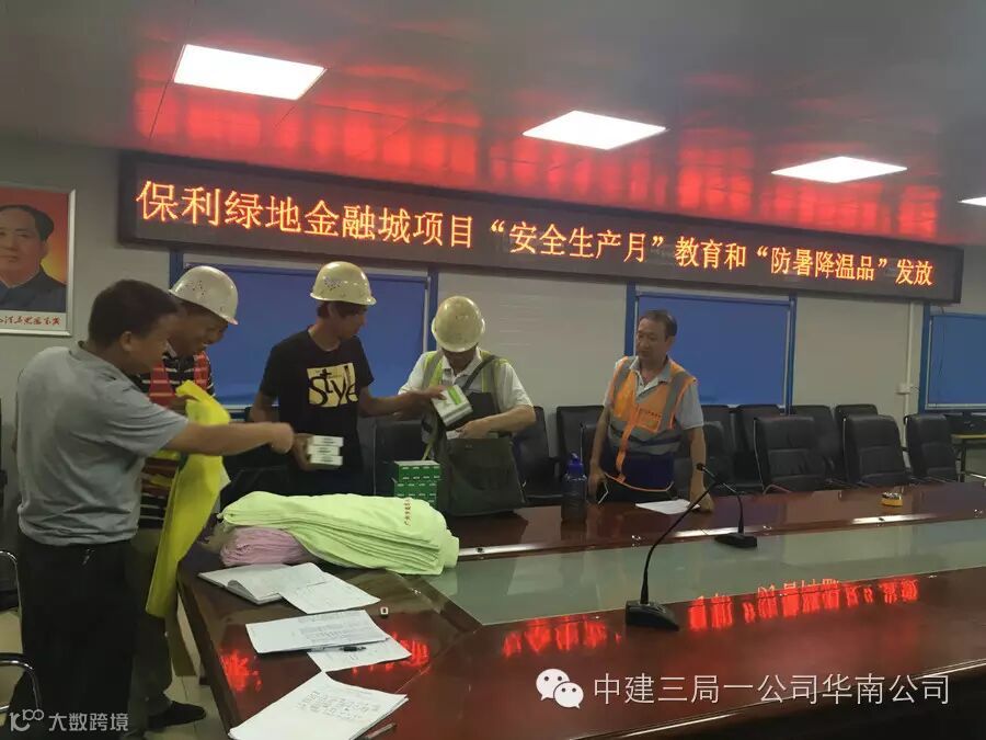 华南公司保利和绿地金融城项目按照 “安全生产月”部署,将800瓶风油精、300盒藿香正气水、800条毛巾等防暑降温用品发放到农民工手上。