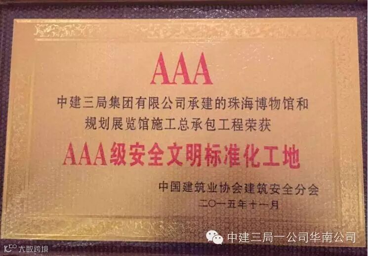 (通讯员 韩成林 姚慧芬)11月6日,中国建筑业协会建筑安全分会年会及理事会在西安市召开,会上公布了2015年全国“AAA级安全文明标准化工地”评价结果,并为获奖项目颁发证书。华南公司承建的广州立白大厦、珠海博物馆和规划展览馆、厦门海沧万科城三期3项目同时荣膺2015年全国“AAA级安全文明标准化工地”。