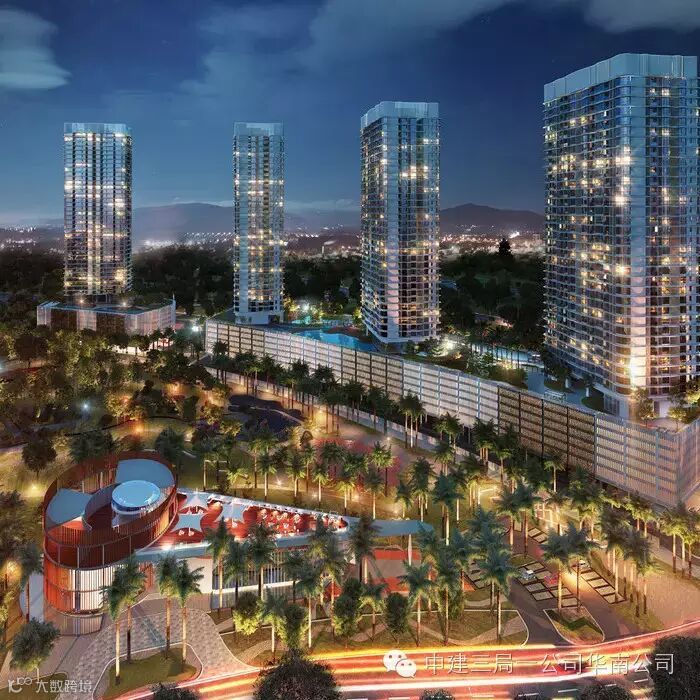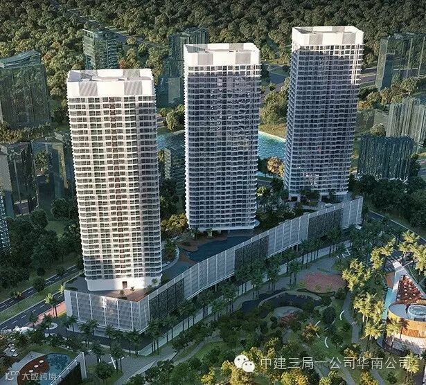 新华联国际度假中心项目位于马来西亚柔佛州新山市,总用地面积44517㎡,工程规划为四期,其中华南公司承建的一期工程总用地面积约19,789㎡,建筑面积约173,113㎡,含3栋40层住宅,总高度138 m,工程总造价2.5亿马币。