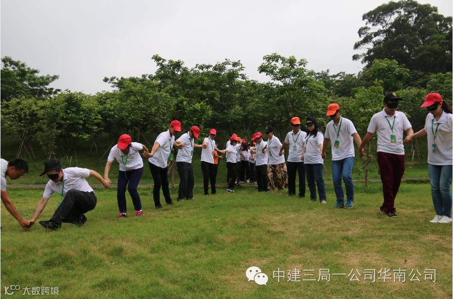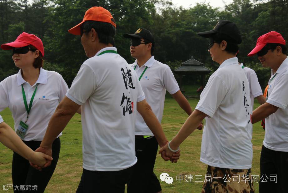 不一会,天空下起了小雨,本次拓展活动也迎来了最后一个项目:“风雨同路人”。所有队员蒙上眼睛,手拉着手,靠相互的信任、相互的扶持一起走过草丛,踏过水沟,踩着台阶,踏上回家的路。什么都看不到,但没有人害怕,因为相信身边的队友。这个活动让大家深刻领悟到:信任是打造职业化团队的必要条件!