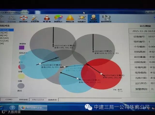 近年来,国内塔吊碰撞事故频频发生,对施工现场作业安全造成极大威胁。中山完美金鹰广场项目施工现场有5栋塔楼、6台塔吊,作业面狭小,给现场施工人员的生命安全带来了隐患。而塔吊群智能防碰撞系统可实现实时预警、远程监控、地面管理、无线传输等功能,能有效预防塔吊与其他物体相碰撞,防止塔吊吊物坠入禁行区域。
