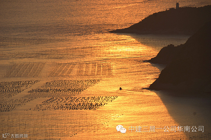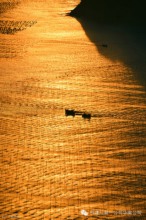 泛着金光的海面之上,不知何时从哪个小鱼港中驶入几艘小船,摇曳在洋面上,拖着长长的金色水波,驶向养殖海域,开始耕耘在这金色富饶的海湾中。这片海域是水产养殖的天然海湾,它养育着世代在此生活的勤劳的人们。