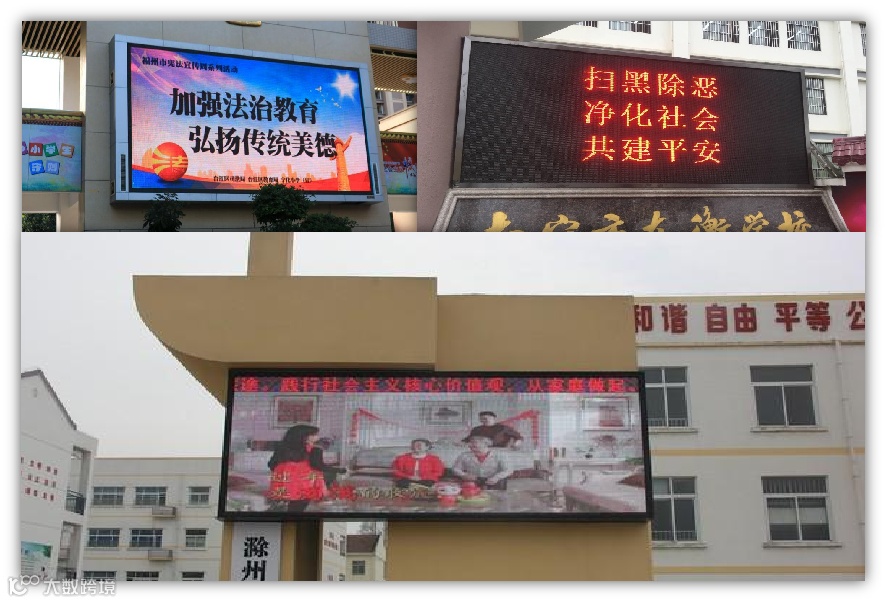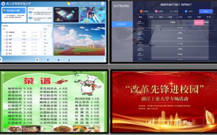 教学楼、食堂、办公楼等室内公共区域,发布党建信息、教务信息、教学信息,教室、活动室、会议室电子门牌,集成显示明厨亮灶等。