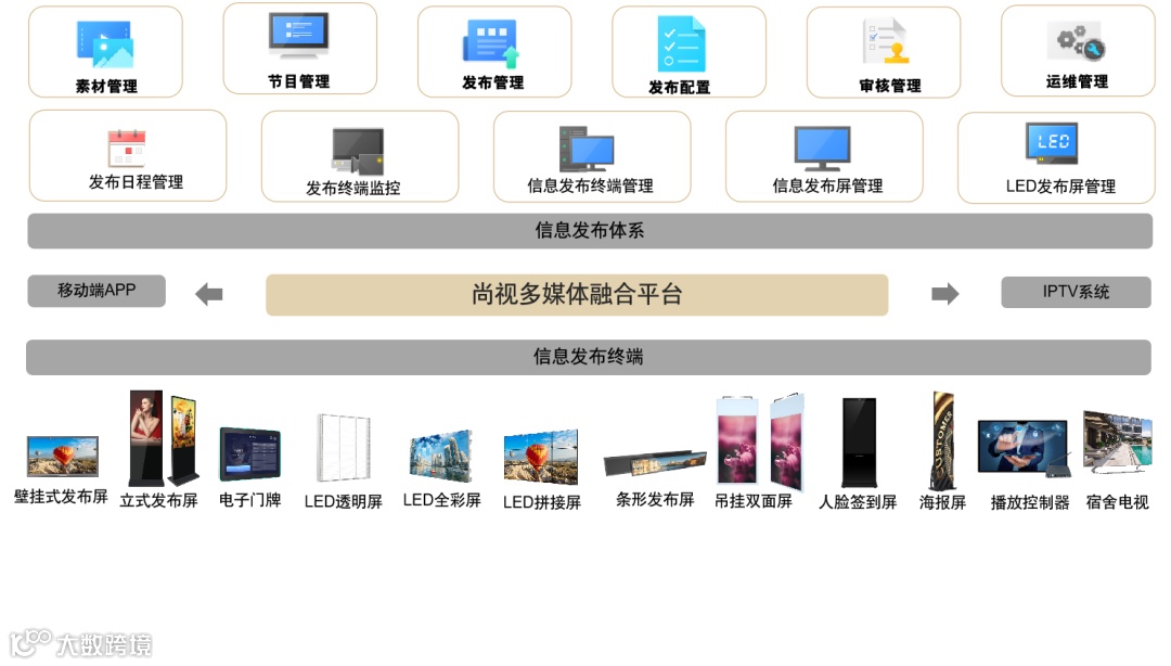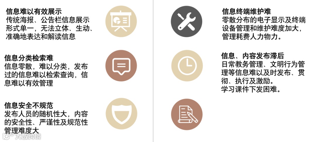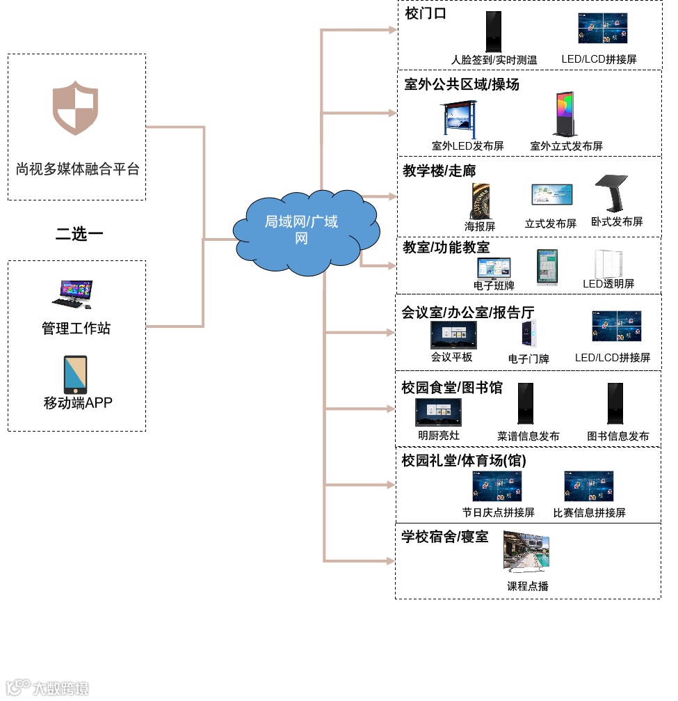 智慧校园信息发布综合解决方案,通过智慧校园电子屏信息发布综合管理系统,全面整合校园内各种电子屏的发布方式、发布内容、发布流程的智能信息发布系统,根据校门口、教学楼、行政楼、宿舍、食堂、操场、报告厅、公共休息区等的不同位置和业务应用特点,建设集校园宣传、教务管理、教学特色、校园服务、校园生活、校园环境为一体的综合性管理平台。