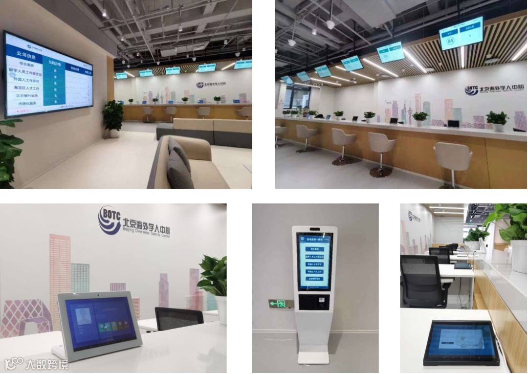 北京海外学人中心微信公众号中植入手机预约功能,入口处部署取号/报到一体机用于预约取号和现场取号,等候区部署壁挂一体机用于显示排队等候情况,办事柜台窗口顶部吊装窗口屏,显示窗口号和正在办理的号码,服务人员工位部署软硬一体叫号器用于呼叫来访人员,办事柜台部署评价器用于服务结束后对人员服务质量进行评价。