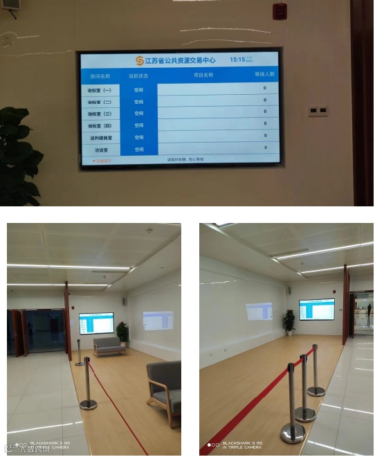 评标办公室外等候区部署综合屏,显示各评标室、答疑室正在进行的项目信息。