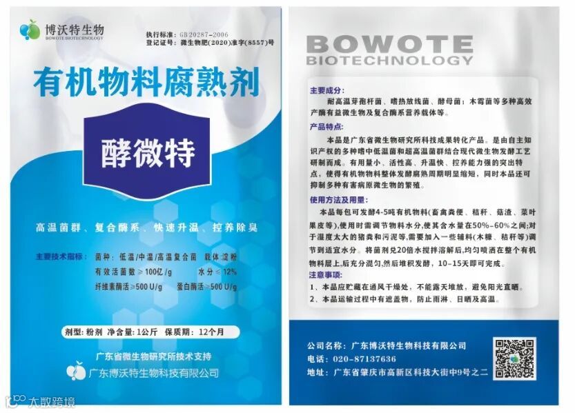酵微特有机物料腐熟剂是广东省科学院微生物研究所科技成果转化产品,由自主知识产权的多种嗜中低温菌和超高温菌群结合现代微生物发酵工艺研制而成。酵微特可有效缩短有机物物料整体发酵腐熟周期,同时还抑制多种有害病原微生物的繁殖,具有用量小、活性高、升温快、能力强的突出特点