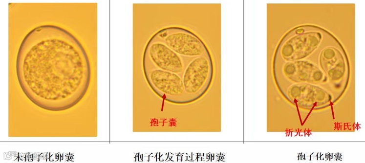 球虫是一种单细胞的宿主特异性的寄生虫,其卵囊被一个厚的外壳包裹,由一个单细胞构成,对外界环境具有非常强的抵抗力。卵囊通过孢子化达到感染性阶段,感染性的卵囊具有4个孢子囊,每个孢子囊含有2个子孢子。