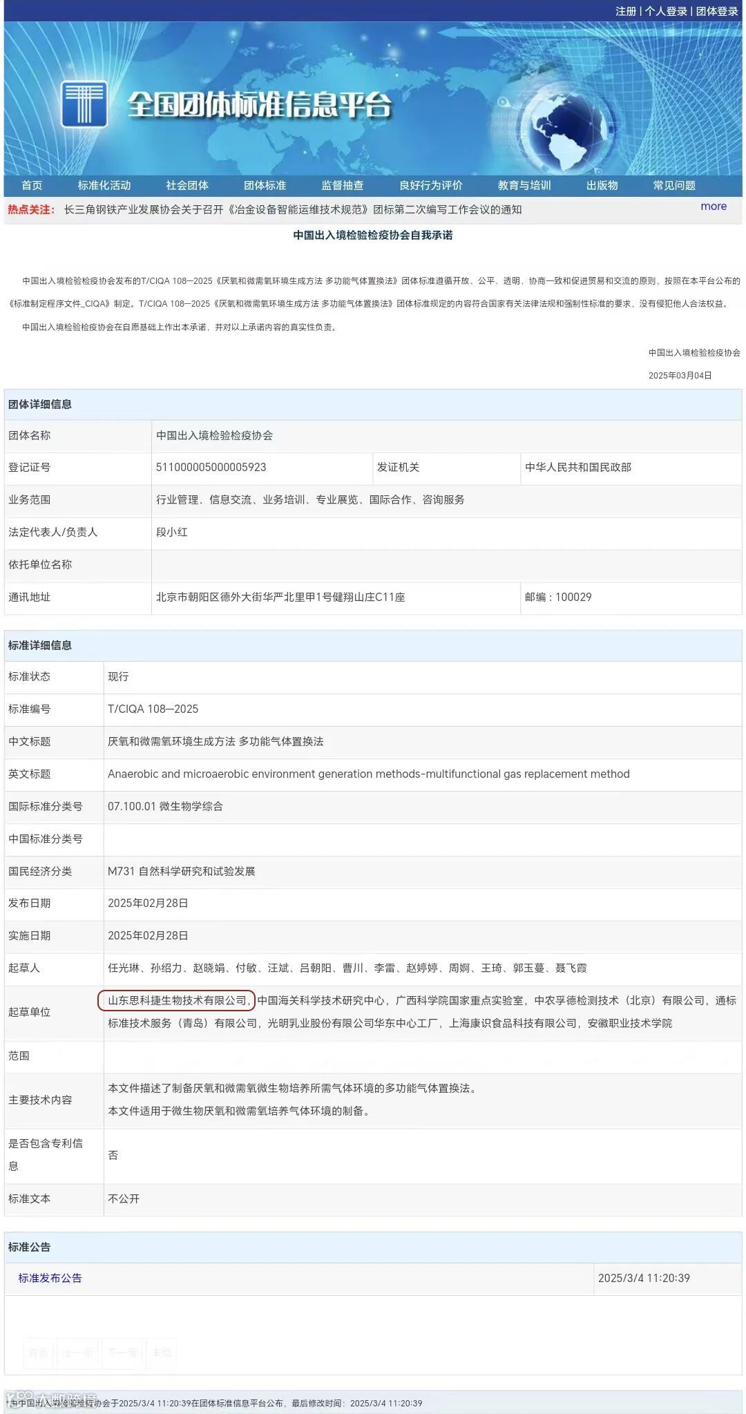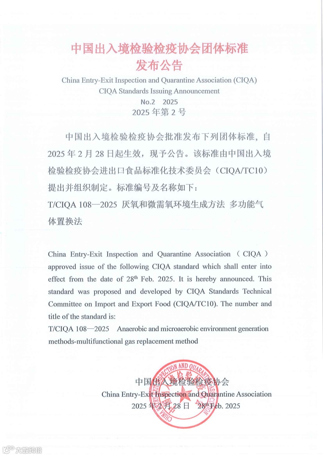 由中国出入境检验检疫协会进出口食品标准化技术委员会(CIQA/TC10)组织起草的《厌氧和微需氧环境生成方法 多功能气体置换法》(T/CIQA 108—2025)团体标准,经协会标准化委员会审核,于2025年2月28日批准发布,自2025年2月28日起实施。