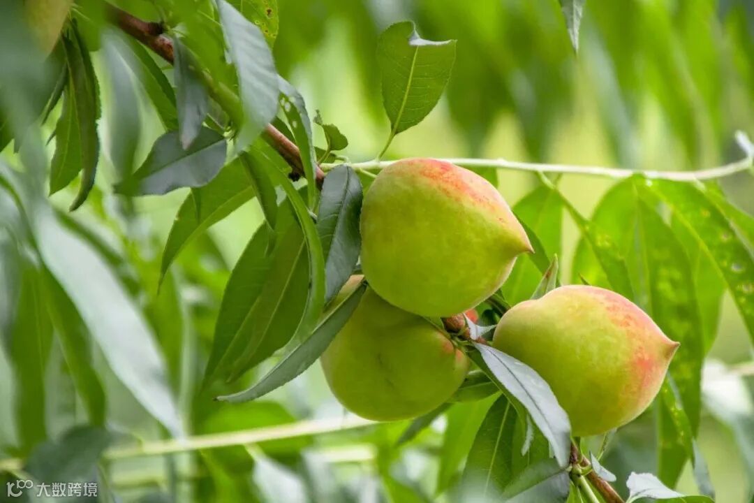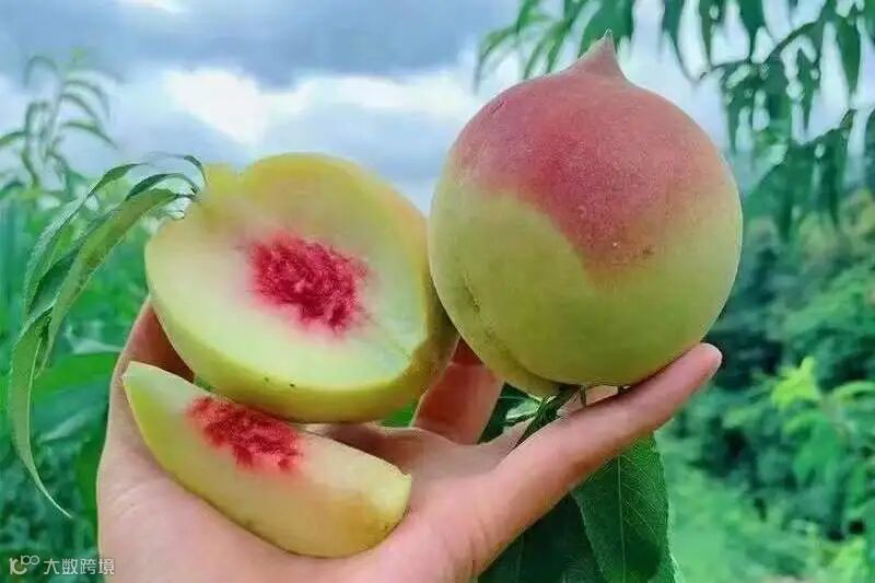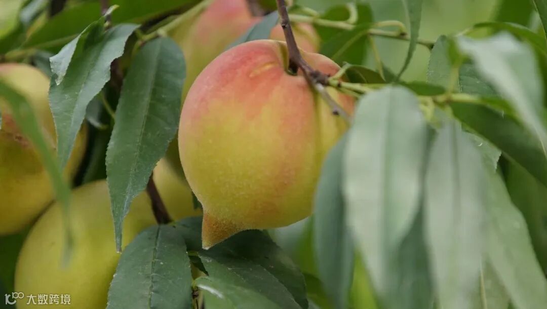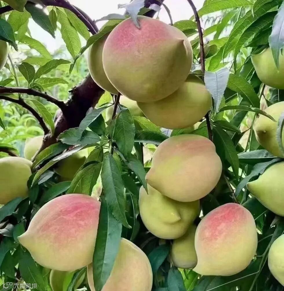 鹰嘴桃,因尾部长相像“鹰嘴”而得名。它果大形美,果顶似鹰嘴,果柄凹陷,缝合线浅,两半较对称。即使成熟,果皮大部分也是青色的,只有受阳光直射的果皮部位才略微带点红色。
