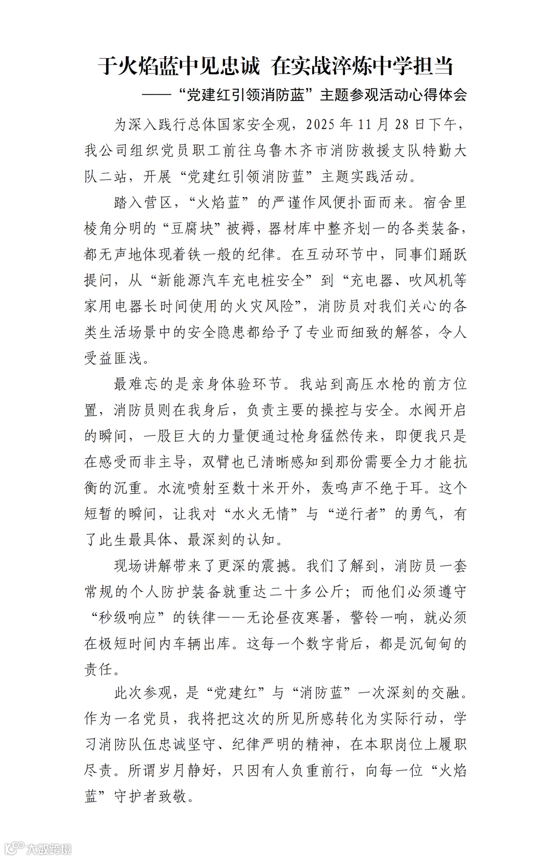 活动结束后,由我公司派至中国出口信用保险公司新疆分公司的雇员周紫薇主动撰写心得体会,分享培训收获。该员工表示:“这次培训让我彻底告别了‘消防知识纸上谈兵’的状态,从法规解读到灭火器实操,每一个环节都干货十足。尤其是火灾案例警示,让我深刻意识到‘隐患险于明火’,今后在工作中一定会养成随手排查隐患、规范操作设备的习惯,做自己和身边人的安全守护者。”