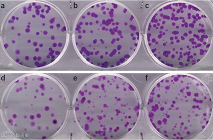 图2 在六孔板上进行克隆增殖实验的传统方法,检测SW-1573肺癌细胞产生的克隆。(a,b)接种100和200个细胞后形成的未经处理的对照分别具有70和115个克隆。(c)接种400个细胞后,这里有太多克隆重叠,因此c孔对于计数是不可靠的。(d,e)4Gy辐射处理后,分别接种400和800个细胞后,形成39和66个克隆。(f)接种1600个细胞后,这里有太多克隆重叠,因此计数不可靠。4Gy辐照后,许多细胞仍分裂2至3倍,并形成了少于50个细胞的小菌落,但无法存活。
