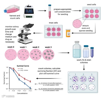 克隆生成实验(Clonogenic assay)是一种细胞生物学技术,用于研究特定处理方式对细胞存活和增殖的影响。克隆生成实验通常用于癌症研究,以确定药物或射线对肿瘤细胞增殖的作用以及或者用于滴定病毒溶液中细胞杀伤颗粒(CKPs)的数量。