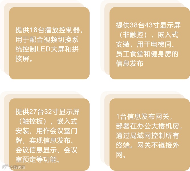 设备选型:32寸显示屏(触控)、43寸显示屏(非触控)、播放控制器、信息发布网关。