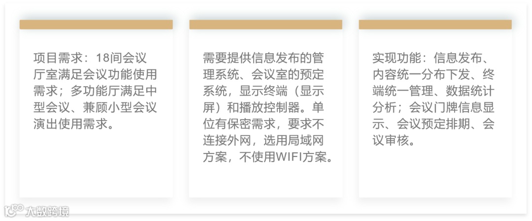 项目介绍:丰台某单位新建的研发实验大楼,设计了18间会议厅室,需要会议发布和预定管理系统,单位有保密要求。