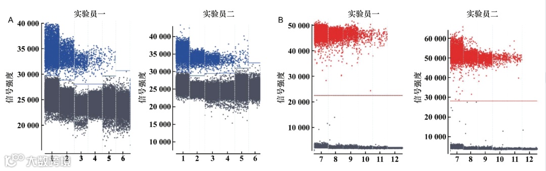 将SV40LTA和E1A的DNA定量参考品进行梯度稀释,选择ST4-ST8进行范围浓度检测,2名实验员分别进行1次检测,各浓度检测1孔,分别计算各梯度稀释管回算浓度。