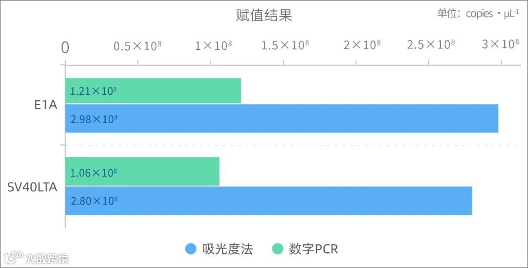 数字PCR的赋值结果是取稀释线性实验部分数据的均值计算得到,赋值方法的结果对比如图2所示,吸光度法定值的结果大于数字PCR方法。