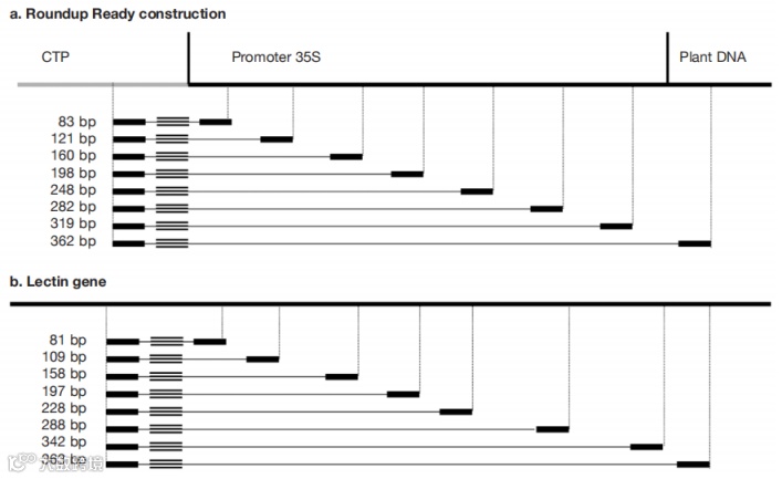 将大豆的RR和Lectin基因作为研究对象,各基因的正向引物被保留,反向引物以+/-40bp的步进移动以增加扩增子的大小。将正向引物保持在探针附近,以使探针在延伸步骤中被Taq聚合酶的核酸外切酶活性快速水解。RR扩增子大小分别为83、121、160、198、248、319和362bp。Lectin扩增子大小分别为:81、109、158、197、228、288、342和363 bp(图1)。