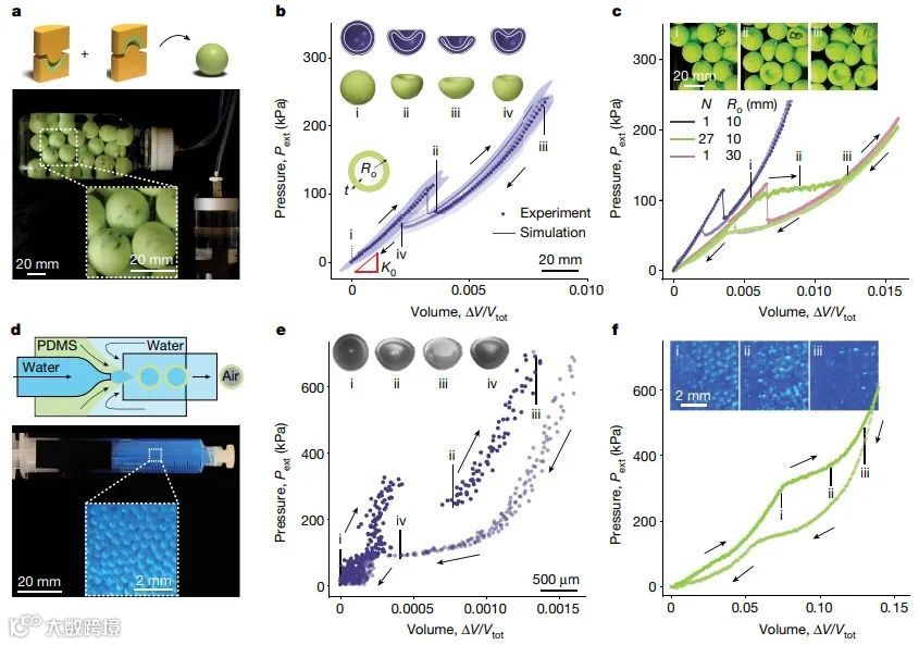 的玻璃圆柱形容器中,并将其完全装满水。然后,再通过注射泵缓慢注入额外体积(ΔV)的水来加压,并使用差压传感器测量容器内的压力。他们先将外半径10 mm、厚度2 mm的单个胶囊放入300 ml的容器中,发现一个很有意思的现象,仅仅多了1个弹性胶囊,所记录的压力-容积曲线却与纯水表现出很大不同。胶囊的存在使流体表现的更可压缩(降低初始体积弹性模量至31 MPa),并且在临界压力(120 kPa)下观察到了突然的压降。该压降产生的原因是弹性胶囊壳发生形变,被压出了一个凹窝,随着ΔV的增加,这种情况变得更加明显(上图b)。而减少ΔV使得悬浮液减压,当压力低于临界压力(50 kPa)时,凹窝尺寸逐渐减小,胶囊弹回呈球形,导致迟滞响应。随后,作者测试了在更大的容器中放一个更大的球形胶囊,以及在一个容器中放入多个(27个)球形胶囊,同样观察到了流体的高度非线性行为,且初始体积弹性模量和临界压力都可独立调节。值得注意的是,在含多个球形胶囊的超流体中,大致相同的压力下多个球形胶囊分别发生形变,出现多个小的压降,从而在整体上出现了一个压力平台期(上图c)。实际应用中,上述实验的厘米级球形胶囊可能并不合适,因而作者制备了外半径250 μm、厚度65 μm的聚二甲基硅氧烷球形胶囊,并将其悬浮液至于注射器中进行压力-体积曲线测试(上图d-f)。微米级的球形胶囊悬浮液表现出与厘米级胶囊相似的非线性行为,表明此种超流体的响应与胶囊大小无关。作者还进行了计算模拟及建模研究,进一步验证了上述实验结果。