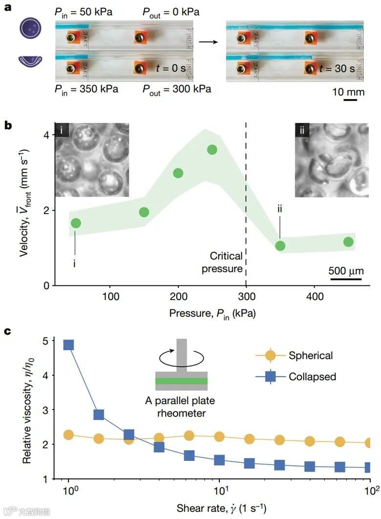 当暴露在不断变化的压力下时,这种流体也会改变其光学性质。作者测试了含微米级球形胶囊悬浮液的透光率,发现在临界压力下,透光率突然从8%增加到30%,这可能要归因于透镜效应和胶囊在坍缩状态下覆盖面积的减少。如此大的透射率变化使得位于超流体下方的哈佛大学标志变得更加清晰(上图)。研究人员还发现,当胶囊呈球形时,超流体的行为类似牛顿流体,这意味着它的粘度只会随着温度的变化而变化。然而,当胶囊受压坍缩时,超流体会变成非牛顿流体,它的粘度会随着剪切力的变化而变化——剪切力越大,流动性越好。这是第一个可以在牛顿态和非牛顿态之间转换的超流体。