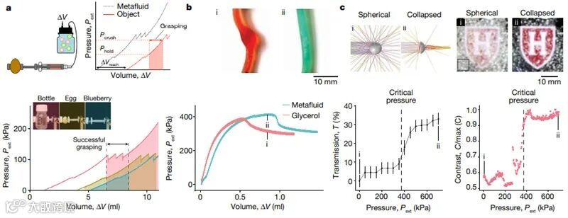度物体的“机器手”。更具体地说,他们设计了一个由加压流体驱动的双颚平行夹持器(上图a),测试了三个不同的物体:直径60毫米、重160克的玻璃瓶,直径约25毫米、重16克的鸡蛋,直径约10毫米、重0.5克的蓝莓。为了成功抓取,ΔV必须足够大,以使“机器手”能够到物体并承受其重量;但ΔV又不能太大,以避免产生过大的力将鸡蛋或蓝莓压碎(上图a)。当使用水或空气作为流体来驱动时,都不能成功地抓住所有三个物体,要么够不到要么压爆;而使用本文的超流体来驱动时,“机器手”可在相同ΔV条件下成功抓住所有三个物体。要知道,在目前的传统液压系统中,机器手需要某种传感或外部控制来调整其抓握力,才能抓取不同大小和抗压强度的物体。但如果使用这种超流体驱动,“机器手”就不需要感应了,超流体本身会做出响应,从而能够拿起一个重些的玻璃瓶、一个易碎的鸡蛋和一颗小小的蓝莓,而不需要额外的编程。