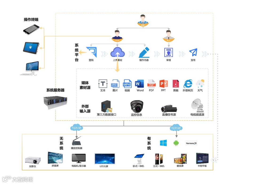 尚视信息发布管理系统是一套可承载本地或是外部多种素材,兼容各种新旧屏显、视听设备,可集中管控和分散执行的信息发布管理系统,在传统信息发布产品的基础上,具备了素材整合、集中远程管控和数据安全的特性。