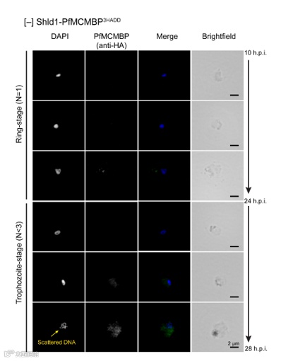 本文的作者鉴定出了微小染色体维持复合物结合蛋白(MCMBP)的疟原虫同系物(PfMCMBP),它与MCM复合物(基因组DNA复制所需的复制解旋酶)结合。为了研究PfMCMBP在恶性疟原虫无性生命周期中的作用,作者通过同源重组将三份带有去稳定结构域的血凝素表位标签融合到3D7菌株中内源PfMCMBP的羧基末端,产生3D7-PfMCMBP3HADD转基因寄生虫株。即在小分子Shield-1 (Shld1)的存在下,PfMCMBP3HADD蛋白稳定,并且将Shld1在培养基中的含量与PfMCMBP建立联系,量化其在胞内的含量。通过Echo荧光显微镜观察发现PfMCMBP缺失的表型,PfMCMBP缺失可以破坏核形态和寄生虫增殖,但不会阻断DNA复制。PfMCMBP缺失促进了MTOCs的形成,MTOCs具有延伸的纺锤体微管,这些微管附着在空间分离的DNA簇中的染色体上。