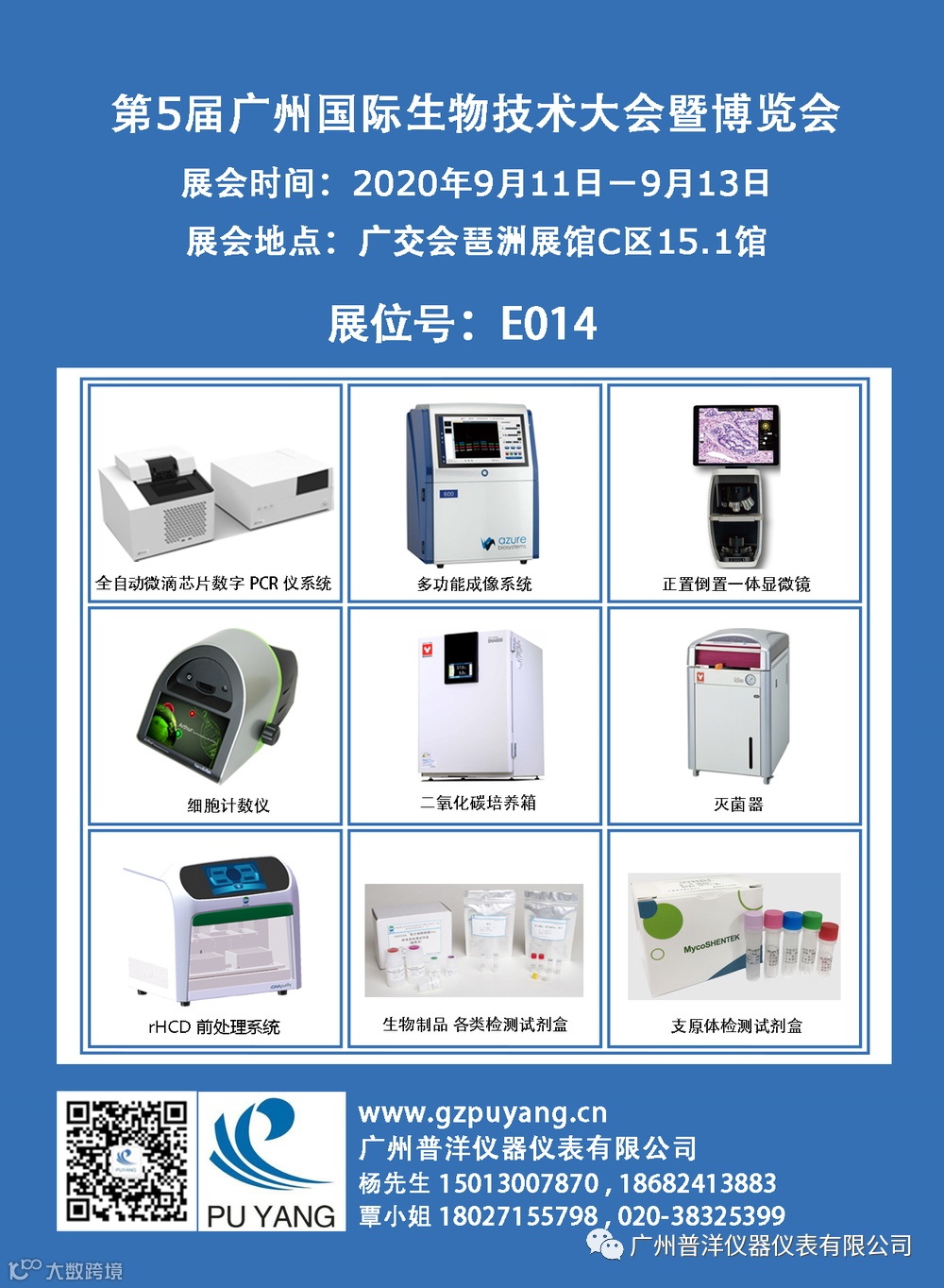 2020第五届广州国际生物技术大会暨博览会(BTE)将于2020年9月11-13日在广州广交会琶洲展馆C区举行,广州普洋仪器仪表有限公司将会携带相关产品亮相此次大会,我们将会在E014展位恭候您的参观咨询。