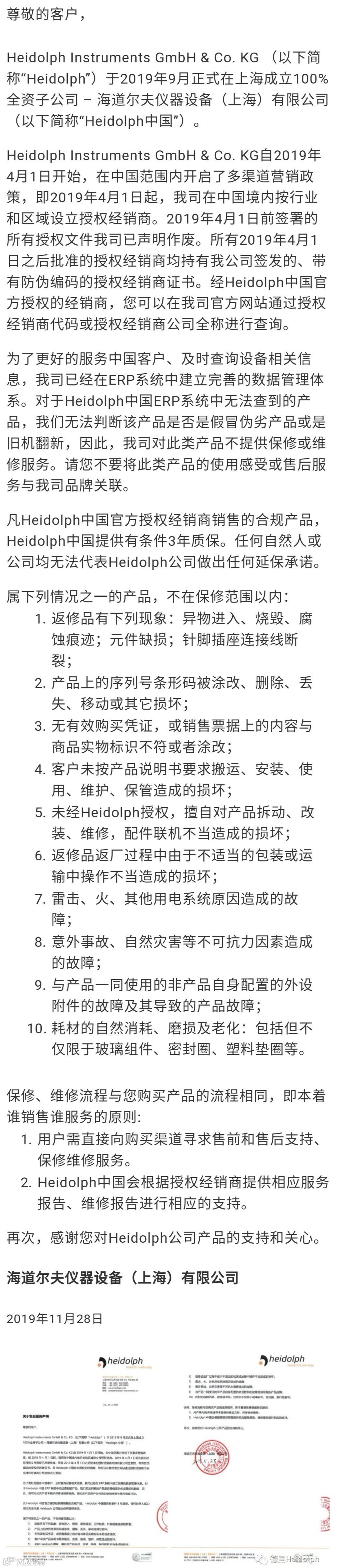 导读:所有2019年4月1日之后批准的授权经销商均持有我公司签发的、带有防伪编码的授权经销商证书。经Heidolph中国官方授权的经销商,您可以在我司官方网站通过授权经销商代码或授权经销商公司全称进行查询。