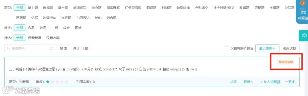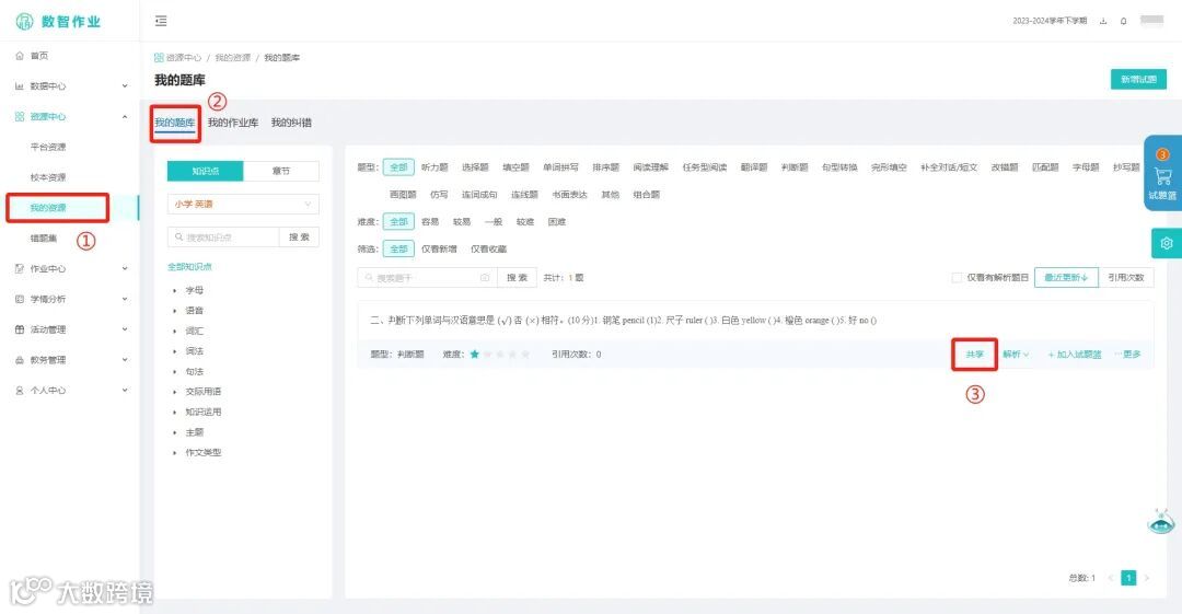 点击【我的资源】进入我的题库,找到上传过的题目,点击【共享】-【校本题库】