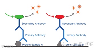 在荧光western blots中,二抗偶联了荧光基团,经入射光激发后产生特定波长的发射光,检测器捕获发射光从而成像,通过软件即可对图像进行数据分析。二抗偶联不同的染料,激发后产生不同波长的发射光,实现同时检测多重蛋白。