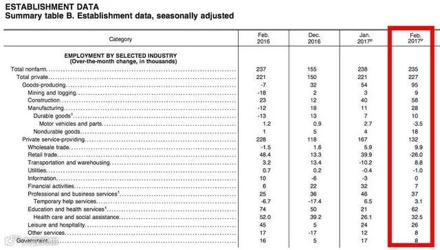 私营部分的就业新增22.7万人,1月增加了22.1万;政府部门新增8000个工作岗位,在特朗普下令冻结政府招聘首月,联邦政府增加2000个岗位;州政府和地方政府新增6000人。