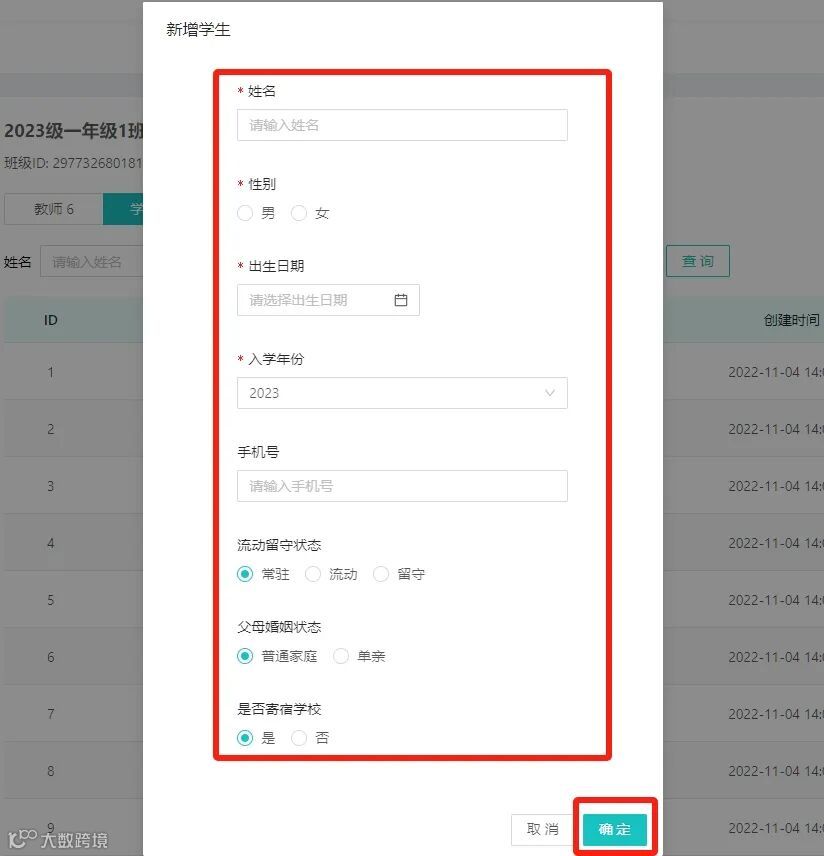 填写完学生基本信息,点击【确认】