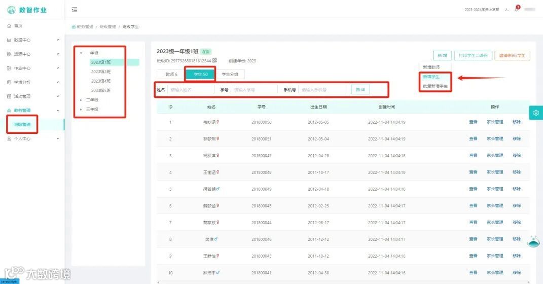 点击【班级管理】-【新增】-【新增学生】
