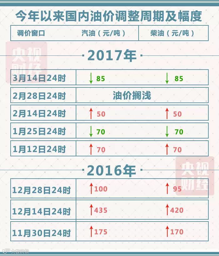 2017年今日油价调整最新消息,今日是3月28日,而今日就是油价新一轮的调整。受美国原油产量和库存增加以及美元汇率走强等诸多利空消息影响,本计价周期内,国际油价震荡走低,进而导致国内参考的原油变化率持续下行。3月27日,据新文化记者采访国内多家分析机构分析师预测,3月28日24时国内的成品油零售限价将迎来大幅下调,加满一箱50升的92号汽油预计将节省8元左右。下面我们一起来看看油价最新消息。
