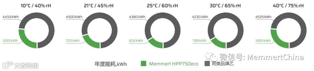 以25℃±2℃/60%rH±5%rH这个操作点来说,这是长期稳定性考察中最常见操作点,也是生产后持续稳定性考察常用的参数(另外一个参数为20℃±2℃),Memmert HPP750eco的能耗仅为652kWh/年同类压缩机制冷稳定性试验箱品牌系列中节能型号的1/7。其余操作点的能耗数据对比可以看出,最小的差距也是相差72%(HPP750eco耗电量是同类产品的28%)。相信在碳中和战略中可以发挥更大作用。